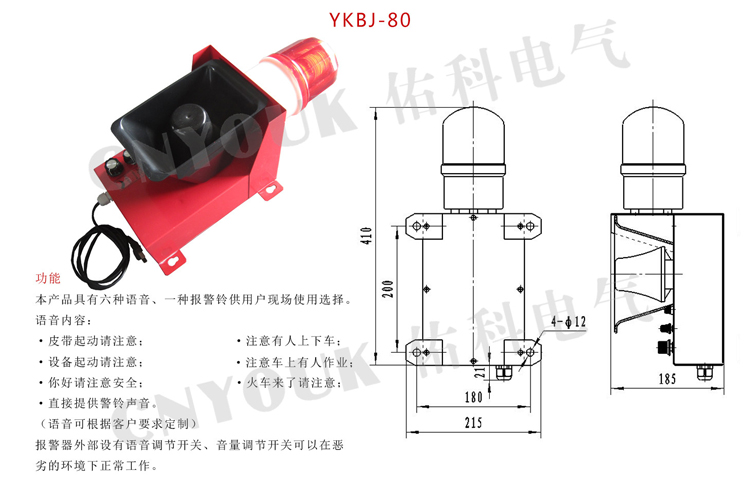 YKBJ-80语音声光报警器是我公司技术人员根据用户之所需,在原有四种报警器的基础上新开发的一种最新产品,是输煤系统起动、铁路道口及大型设备行走报警的最佳产品。其优点集语音、声、光于一体,并可直接接入交流220V电源工作,改变了原来只有声或只有光的缺陷。