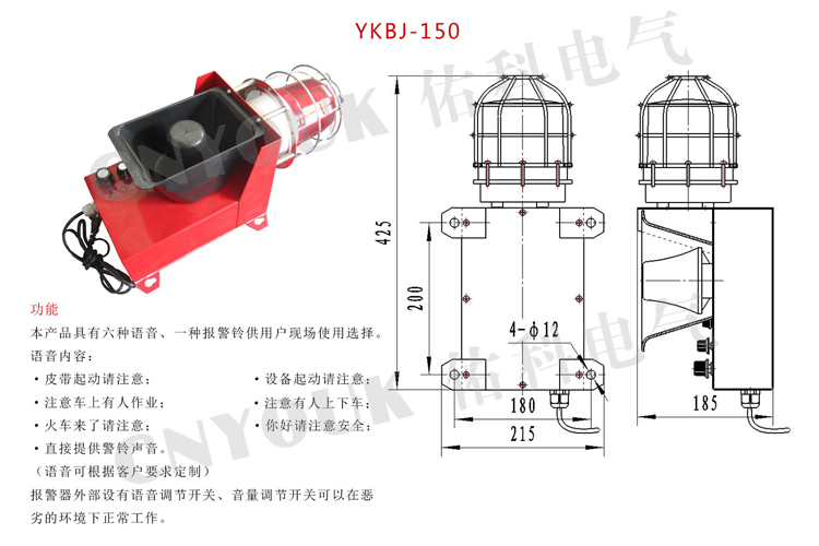 YKBJ-100语音声光报警器是我公司技术人员根据用户之所需,在原有四种报警器的基础上新开发的一种最新产品,是输煤系统起动、铁路道口及大型设备行走报警的最佳产品。其优点集语音、声、光于一体,并可直接接入交流220V电源工作,改变了原来只有声或只有光的缺陷。