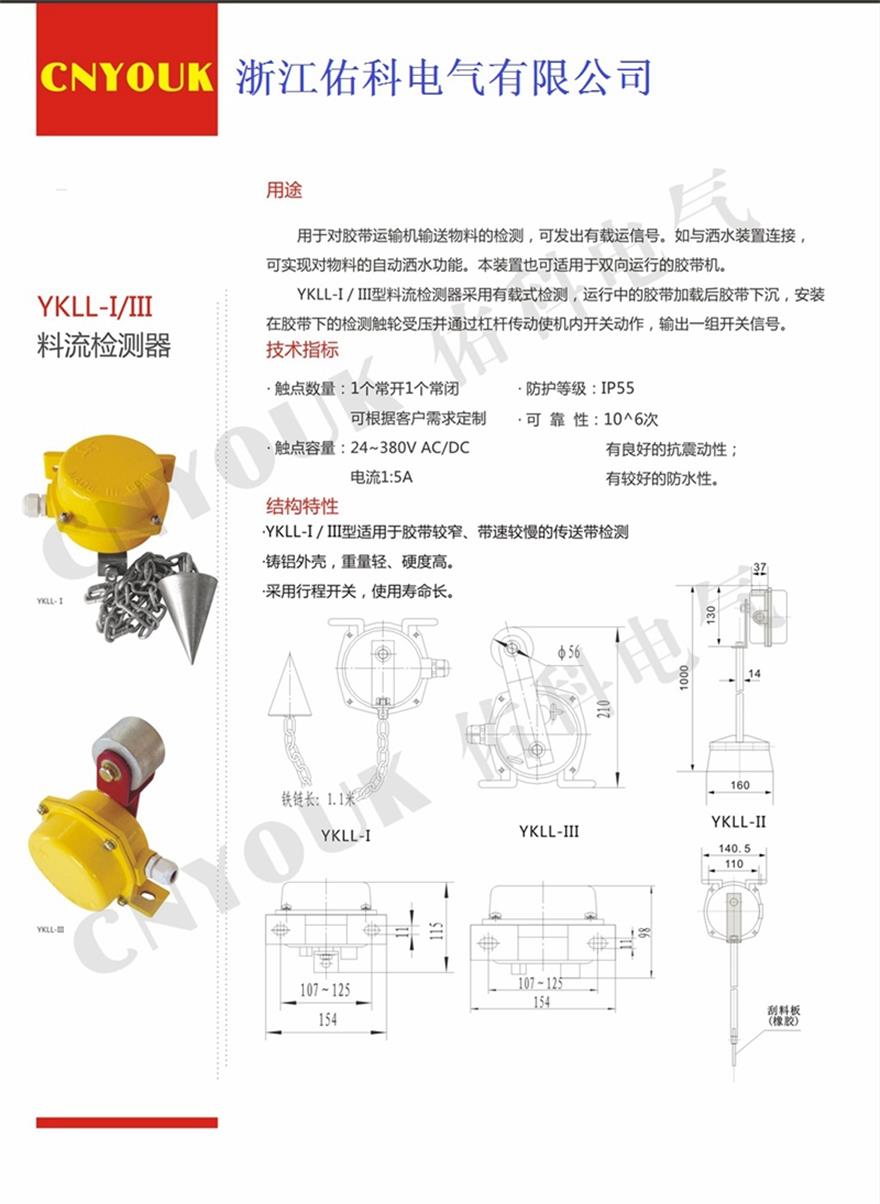 本开关采用有载式检测,运行中的胶带加载后胶带下沉,安装在胶带下的检测触轮受压并通过杠杆传动使机内开关动作,输出一组开关信号。