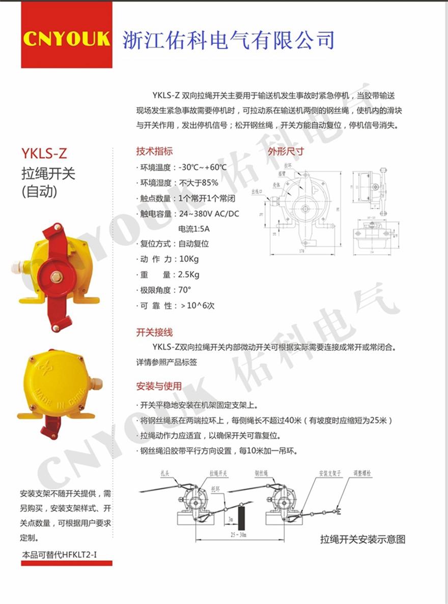 本开关主要用于输送机发生事故时紧急停机,当胶带输送现场发生紧急事故需要停机时,可拉动系在输送机两侧的钢丝绳,使机内的滑块与开关作用,发出停机信号;松开钢丝绳,开关方能自动复位,停机信号消失。