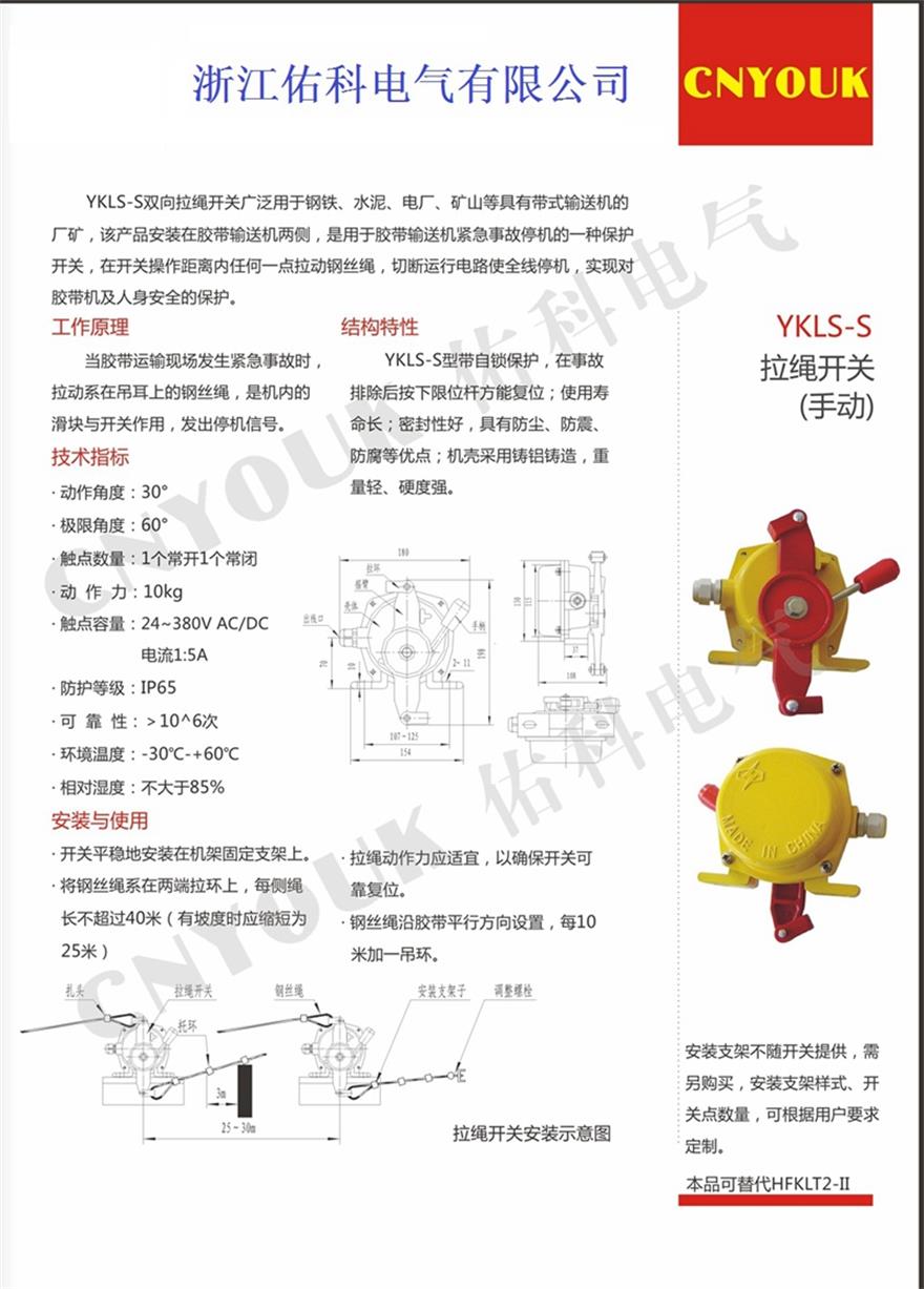本开关广泛用于钢铁、水泥、电厂、矿山等具有带式输送机的厂矿,该产品安装在胶带输送机两侧,是用于胶带输送机紧急事故停机的一种保护开关,在开关操作距离内任何一点拉动钢丝绳,切断运行电路使全线停机,实现对胶带机及人身安全的保护。
