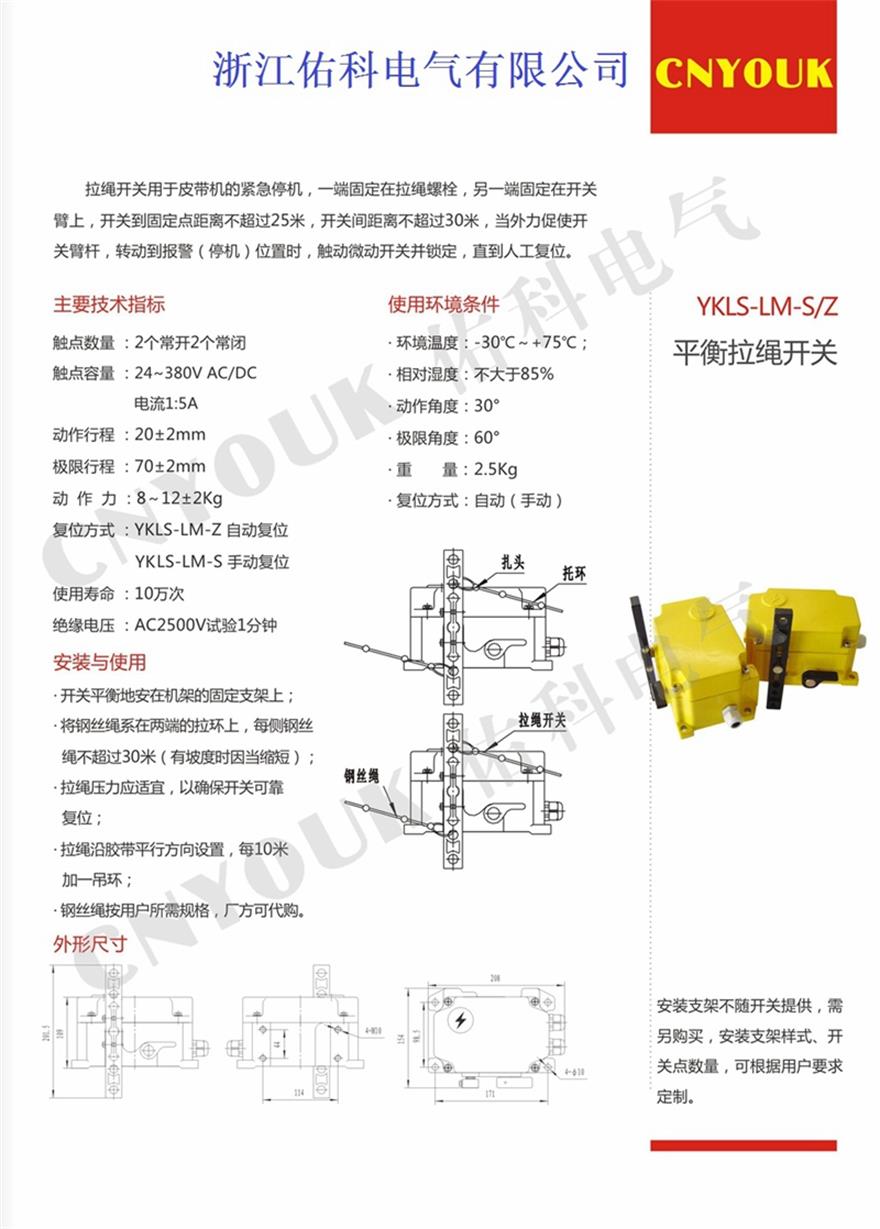 拉绳开关用于皮带机的紧急停机,一端固定在拉绳螺栓,另一端固定在开关臂上,开关到固定点距离不超过25米,开关间距离不超过30米,当外力促使开关臂杆,转动到报警(停机)位置时,触动微动开关并锁定,直到人工复位。