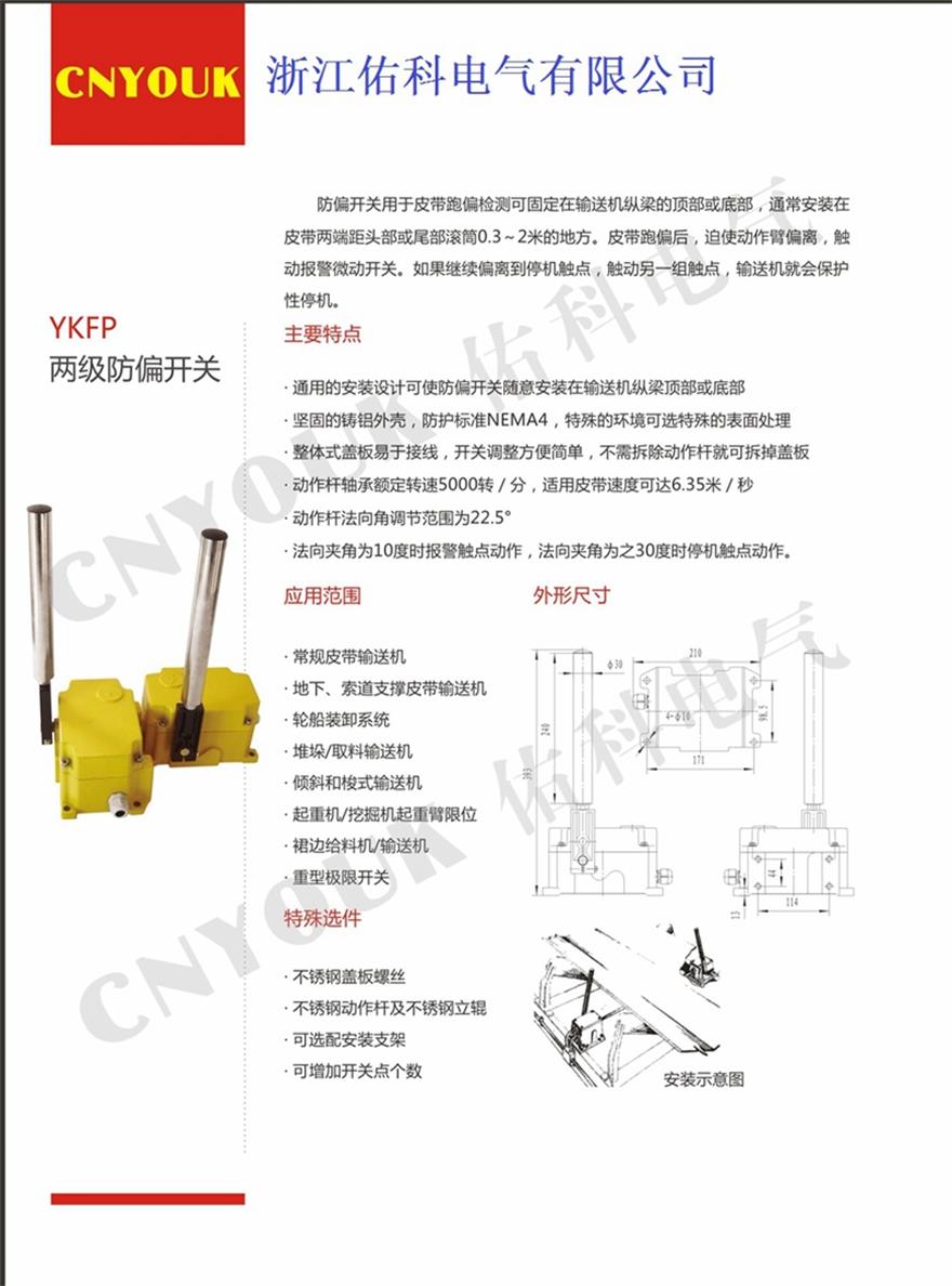本开关用于皮带跑偏检测可固定在输送机纵梁的顶部或底部,通常安装在皮带两端距头部或尾部滚筒0.3~2米的地方。皮带跑偏后,迫使动作臂偏离,触动报警微动开关。如果继续偏离到停机触点,触动另一组触点,输送机就会保护性停机。