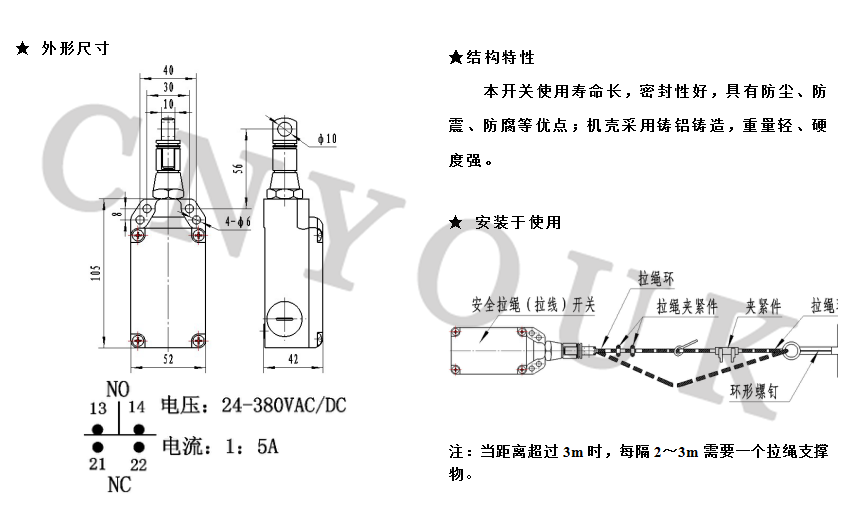 当在机器设备或装备每处都能达到紧急断电时,便需要安全拉绳开关,由一根预张紧的拉绳可以使得急停开关被操动。