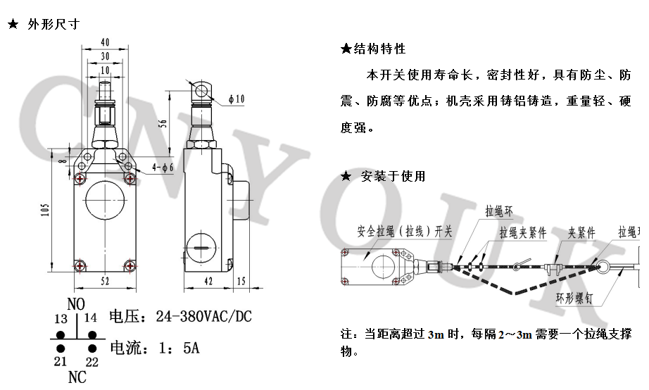 本开关广泛用于钢铁、水泥、电厂、矿山等具有带式输送机的厂矿,该产品安装在胶带输送机两侧,是用于胶带输送机紧急事故停机的一种保护开关,在开关操作距离内任何一点拉动钢丝绳,切断运行电路使全线停机,实现对胶带机及人身安全的保护。